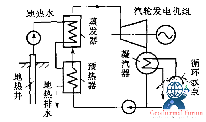 雙循環(huán)地?zé)岚l(fā)電系統(tǒng)是利用地下熱水來加熱某種低沸點(diǎn)工質(zhì),使其進(jìn)入汽輪機(jī)工作的地?zé)岚l(fā)電系統(tǒng),又稱中間介質(zhì)法或低沸點(diǎn)工質(zhì)循環(huán)。它是為克服閃蒸地?zé)岚l(fā)電系統(tǒng)的缺點(diǎn)而出現(xiàn)的一種循環(huán)系統(tǒng)。地下熱水用深井泵抽到地面進(jìn)入電站內(nèi)的蒸發(fā)器,加熱某一種低沸點(diǎn)介質(zhì)(如氟里昂11、氯乙烷等),使之變?yōu)榈头悬c(diǎn)介質(zhì)蒸氣,然后通入汽輪機(jī)做功發(fā)電,汽輪機(jī)排出的乏汽經(jīng)凝汽器冷凝成液體,用工質(zhì)泵再打回蒸發(fā)器重新加熱,循環(huán)使用。為充分利用地?zé)崴?/a>的余熱,讓從蒸發(fā)器排出的地?zé)崴?/a>經(jīng)過一個預(yù)熱器先預(yù)熱來自凝汽器的低沸點(diǎn)工質(zhì)液體,使其溫度上升至接近蒸發(fā)器內(nèi)的工質(zhì)飽和溫度,再進(jìn)入蒸發(fā)器。為了保證從地?zé)峋?/a>來的地?zé)?/a>水在輸送過程中不閃蒸成蒸氣和不使溶解氣體從水中逸出,在管路中的熱水始終保持超過其溫度對應(yīng)的飽和壓力。