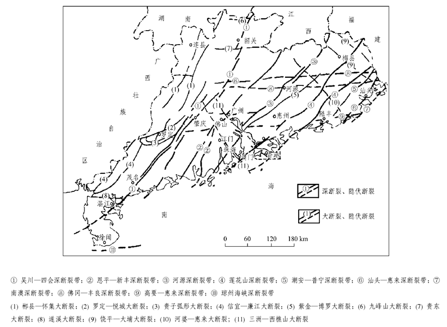 廣東省在大地構(gòu)造上屬華南褶皺系的一部分,其演化過程經(jīng)歷了三個(gè)發(fā)展階段及相應(yīng)的構(gòu)造旋回和構(gòu)造運(yùn)動(dòng):加里東運(yùn)動(dòng)形成緊密線型褶皺,主要呈NEE方向,成為廣東省構(gòu)造骨架的基礎(chǔ);印支運(yùn)動(dòng)形成多方向的過渡型蓋層褶皺;燕山運(yùn)動(dòng)以斷塊造山、NE向和EW向深大斷裂控制的火山噴發(fā)、巖漿侵入為主。深大斷裂對(duì)廣東省的沉積建造、巖漿活動(dòng)、變質(zhì)作用和成礦作用有較明顯的控制。主要的深斷裂有吳川-四會(huì)、恩平-新豐、河源、蓮花山、潮安-普寧、汕頭-惠來、南澳、佛岡-豐良、高要-惠來、瓊州海峽等,主要的大斷裂有郴縣-懷集、羅定-悅城、貴子、信宜-廉江、紫金-博羅、九峰山、貴東、遂溪、饒平-大埔、河婆-惠來、三洲-西樵山等。這些深大斷裂都具有規(guī)模大、活動(dòng)時(shí)間長(zhǎng)等特點(diǎn)。從總體上看。廣東省境內(nèi)大型褶皺和深大斷裂以NE向?yàn)橹鳎g夾EW向和NW向構(gòu)造組成復(fù)雜的構(gòu)造圖景。