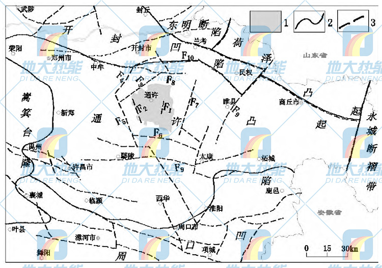 通許隆起大地構(gòu)造屬巨型秦嶺緯向構(gòu)造帶的東端和新華夏系第二沉積帶的復(fù)合部位, 屬嵩箕山脈的東延。北為開封凹陷及荷澤凸起, 南為周口凹陷, 西至嵩箕臺隆, 東鄰永城斷褶帶。隆起內(nèi)EW、NE、NW向三組斷裂將基底切割成破碎的斷塊狀, 局部形成新生代小斷陷。通許縣由于處于隆起區(qū)中部 , 斷裂構(gòu)造不發(fā)育, 對該區(qū)地?zé)?/a>形成有一定影響的斷層有四所樓-練成斷裂 (F1) 、豎崗斷裂 (F2) 、半坡—水坡斷裂 (F3) 、崔橋斷裂 (F6) 、杞縣斷裂 (F7) 、中牟—開封斷裂 (F10) 。