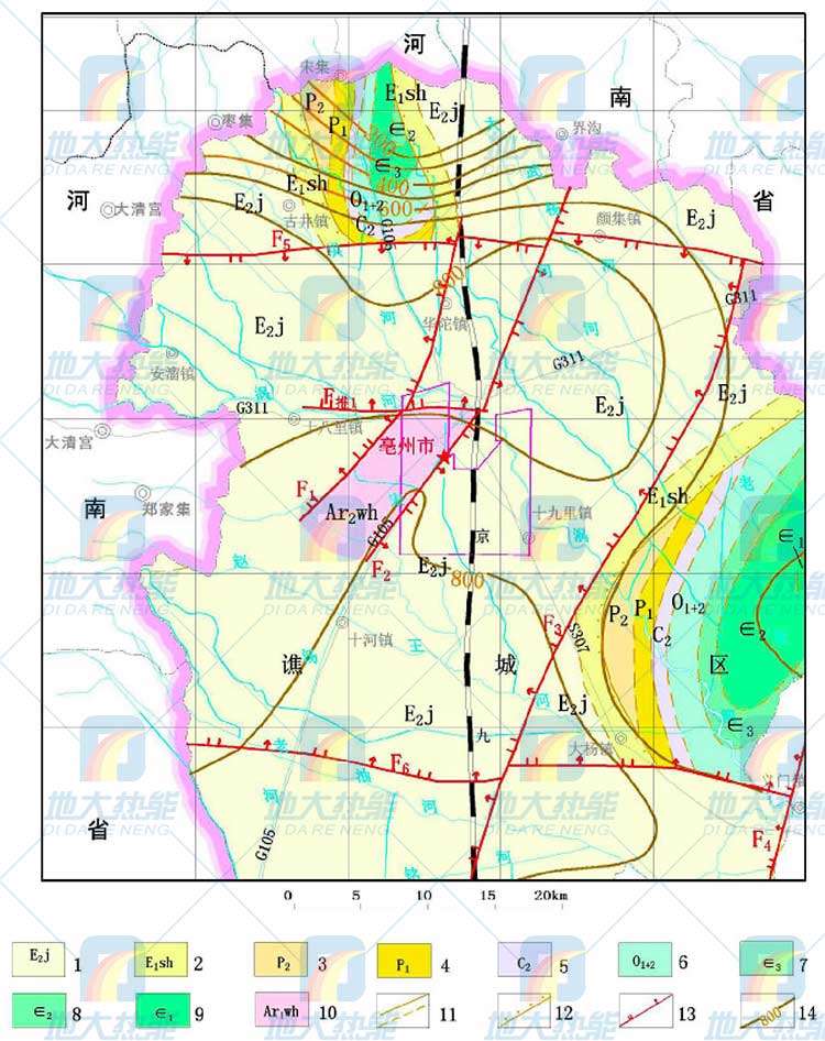 亳州市地層屬于華北地層區(qū)淮河地層分區(qū)淮北地層小區(qū)。區(qū)域地層主要發(fā)育有太古界五河群、下古生界寒武、奧陶、上古生界石炭、二疊系、新生界新近系、古近系和第四系,地表皆為第四系覆蓋。對(duì)地?zé)?/a>與供水意義較大的地層如下: